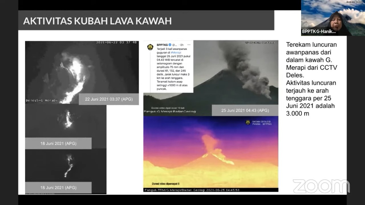 Mengawali paparannya, Hanik Humaida mengungkapkan status siaga Gunung Merapi ditetapkan mulai tanggal 5 November 2020. “Merapi ini kenaikan aktifitasnya kan sudah cukup lama ya, jadi memang rangkaian panjang Merapi saat ini merupakan kegiatan sejak tahun 2018,” kata Hanik.