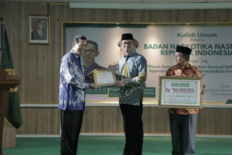 Penyerahan Wakaf tersebut dilaksanakan di Auditorium Kampus Utama UmrI di sela-sela kuliah umum bertajuk “Peran Generasi Muda Dalam Strategi Soft Power Approach BNN RI Guna Mewujudkan Indonesia Bersinar” yang disampaikan oleh Direktur Rehabilitasi Narkoba BNN Brigjen Pol Dr dr Farid Amansyah SpPD Finasim.