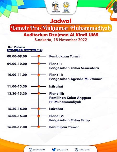 Sidang tanwir akan dimulai pada pukul 08.00 Wib. Kemudian Pukul 09.00 Wibdilanjutkan dengan Sidang Pleno I dengan materi Pengesahan calaon sementara. Kemudian pukul 10.00 Wib dilanjutkan Sidang Pleno II dengan materi Pengesahan agenda Muktamar.