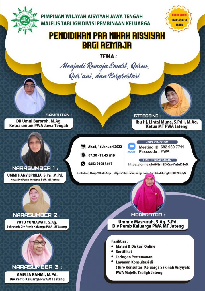 Pimpinan Wilayah ‘Aisyiyah Jawa Tengah Majelis Tabligh Divisi Pembinaan Keluarga (DPK) menggelar “Pendidikan Pra Nikah ‘Aisyiyah” dengan sasaran remaja usia sekolah (14 – 18 tahun) secara virtual melalui aplikasi zoom meeting pada Ahad (16/01/2022) diikuti oleh 200 partisipan yang sebelumnya telah mendaftar melalui link pendaftaran yang telah disiapkan panitia. Peserta yang hadir merupakan utusan pengurus Ikatan Pelajar Muhammadiyah (IPM), OSIS SMP/MTs, SMA/SMK/MA dan Pondok Pesantren se-Jawa Tengah yang berada di bawah naungan Muhammadiyah, dan ada pula beberapa peserta berasal dari sekolah negeri.