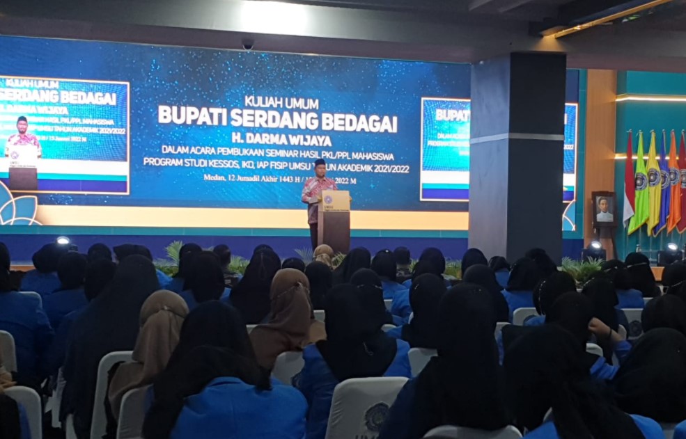 Medan, Infomu.co – Bupati Serdang Bedagai H. Darma Wijaya menyampaikan kuliah umum dihadapan sekitar 400 mahasiswa dari Fakultas UMSU, di Auditorium kampus utama Sabtu (15/1).