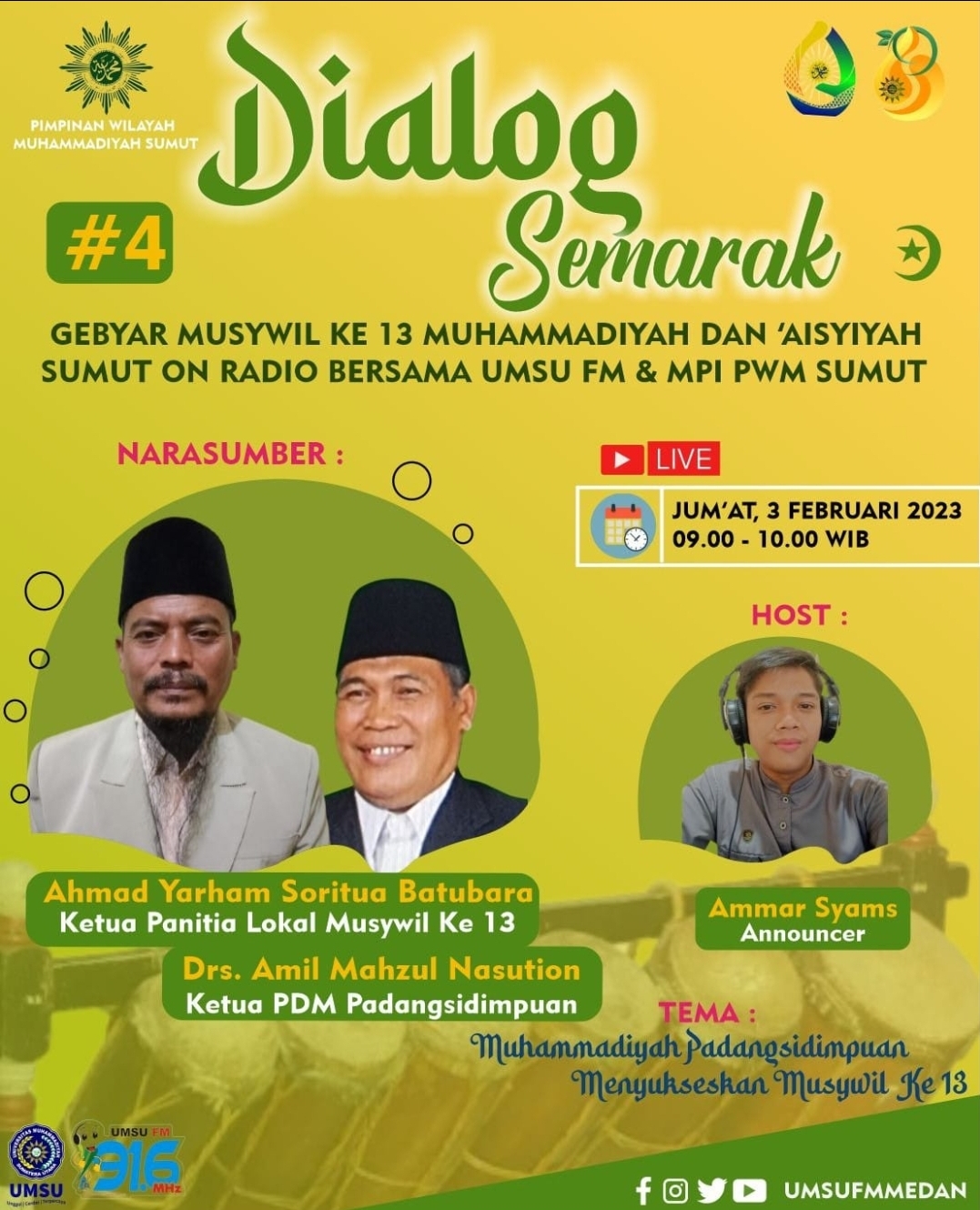 Medan, InfoMu.co –  Bincang-bincang on radio #4 di Radio UMSU 91,6 akan berlangsung Jumat ( 3/2 ) kali ini akan menghadirkan dua tokoh Muhammadiyah Kota Padangsidimpuan. Pertama Drs. Amil  Mahzul Nasution, Ketua PDM  dan  Ahmad Yarham Batubara,  Ketua Lokal Musywil 13. Bincang-bincang on Media berlangsung pukul 09.00-10.00 Wib mengambil tema : Muhammadiyah Padangsidimpuan Sukseskan Musywil ke 13.