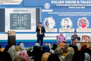 Medan, InfoMu.co – Fakultas Ekonomi dan Bisnis melalui Program Studi Ekonomi Pembangunan menggelar Kuliah Umum dan Talkshow, guna mendorong kreatifitas mahasiswa dalam menghadapi Era Industri Revolusi 4.0 dan Society 5.0 di aula Kampus Utama UMSU, Jl Mukhtar Basri, Kamis (16/6). Kuliah Umum dan Talkhow itu menghadirkan tiga narasumber yang memberikan motivasi apa seharusnya yang dilakukan generasi Z (Gen-Z) di era industri revolusi 4.0.