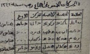“…Jadwal al-majmu’ah yang disebelah kiri. Maka periksalah dahulu al-hisshah jika jatuhnya pada hamal atau mizan kurang daripada يب (maksudnya dalam hisab jumal adalah 12) darajah atau pada buruj hut atau sunbulah lebih daripada يج (maksudnya dalam hisab jumal adalah 12) darajah maka bulan itu akan terjadi gerhana jika