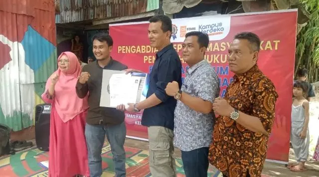 Usai ceramah hukum, tim Pengabdian Masyarakat memberikan santunan sebanyak 100 paket sembako kepada warga di sana berupa : beras, minyak goreng dan gula. (Syaifulh)