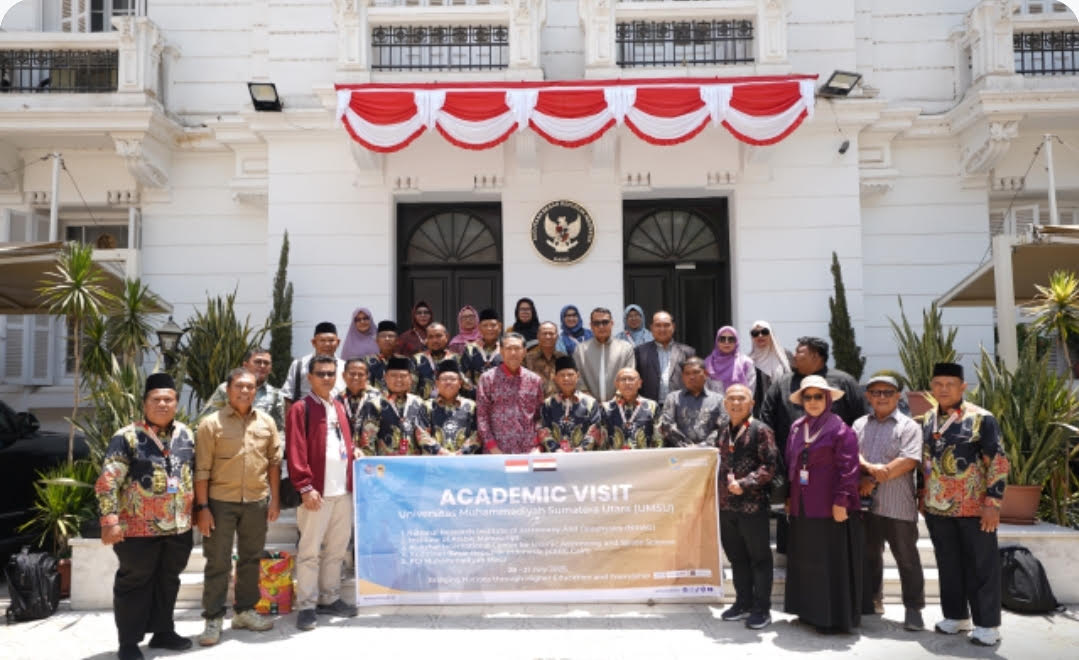 INFOMU.CO | Kairo – Internasionalisasi Muhammadiyah terus bergulir di banyak negara. Perkembangan PCIM di 30 kawasan di dunia menjadi bagian dari program internasionalisasi diputuskan pada Muktamar ke-48 di Surakarta. Program internasionalisasi itulah yang kemudian dilakukan secara bersama oleh Pimpinan Wilayah Muhammadiyah Sumatera Utara bersama Universitas Muhammadiyah Sumatera Utara (UMSU) dengan mengirim delegasi untuk berkunjung ke KBRI di Mesir, Kairo. Kunjungan berlangsung, Senin (28/7) kemarin.