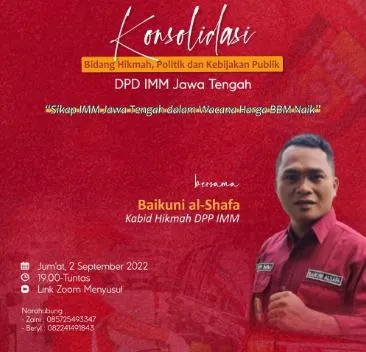 Konsolidasi IMM se Jawa Tengah yang diselenggarakan malam tadi menghasilkan beberapa keputusan, di antaranya : IMM se Jawa Tengah akan menggelar aksi turun ke jalan secara bertahap dimulai dari regional Banyumas Raya pada Senin, 5 September 2022; diikuti regional Semarang Raya maksimal 10 ke depan hari terhitung dari semalam; dan aksi terakhir dilakukan regional Solo Raya yang pelaksanaanya masih didiskusikan. (SM)