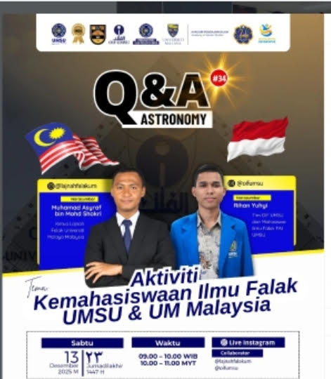 INFOMU.CO |  Medan – Sebagai tindak lanjut lawatan ilmiah UM ke UMSU bulan lalu, Obervatorium Ilmu Falak Universitas Muhammadiyah Sumatera Utara (OIF UMSU) kembali menunjukkan peran aktifnya di kancah internasional dengan mengadakan Live Q &a A Astronomi Episode 34 yang berkolaborasi dengan Lajnah Falak Universiti Malaya (UM), Malaysia. Pada Sabtu, 13 Desember 2025 / 23 Jumadilakhir 1447 H secara