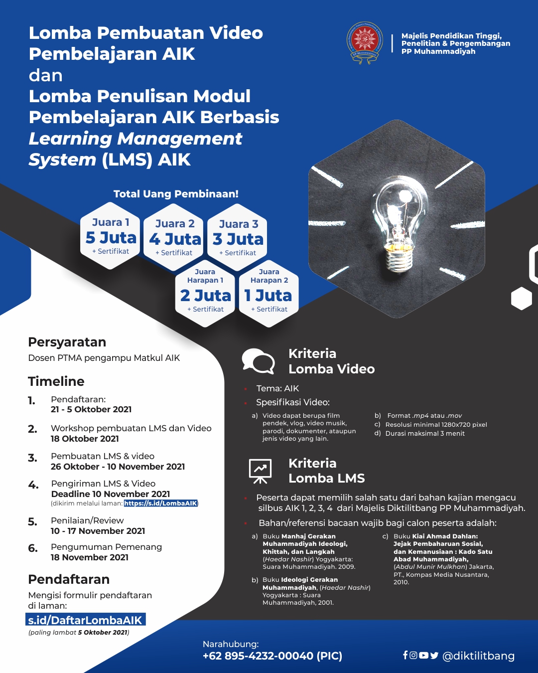 Dalam rangka menguatkan kembali aktualiasi Ideologi Muhammadiyah dalam kerangka pembelajaran Al-Islam dan Kemuhammadiyahan (AIK), sekaligus penguatan bagi dosen AIK PTM se-Indonesia. Pimpinan Pusat Muhammadiyah melalui Majelis Pendidikan Tinggi Penelitian dan Pengembangan (Diktilitbang) akan mengadakan Lomba Pembuatan Video Pembelajaran AIK dan Lomba Penulisan Modul Pembelajaran AIK Berbasis Learning Management System (LMS) AIK.