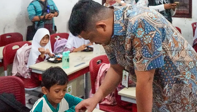 Bobby mengunjungi beberapa ruang kelas untuk memastikan paket makan bergizi disajikan dengan baik di meja siswa.