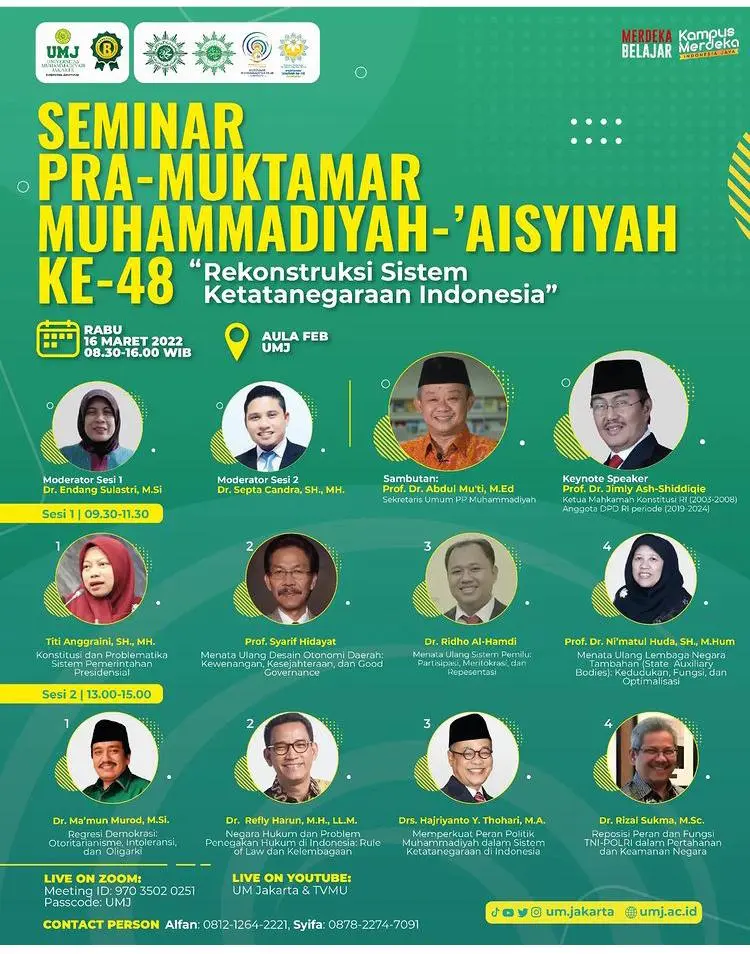 Jakarta, InfoMu.co – Akhir-akhir ini, muncul beberapa gejala terkait dengan sistem ketatanegaraan di Indonesia. Baik gejala distorsi, gejala deviasi, hingga gejala stagnansi. Mengantisipasi hal tersebut, Muhammdiyah melalu Universitas Muhammadiyah Jakarta (UMJ) menyelenggarakan Seminar Pra Muktamar Muhammadiyah – ‘Aisyiyah ke-48 pada Rabu (16/3), bertempat di Aula FEB UMJ.