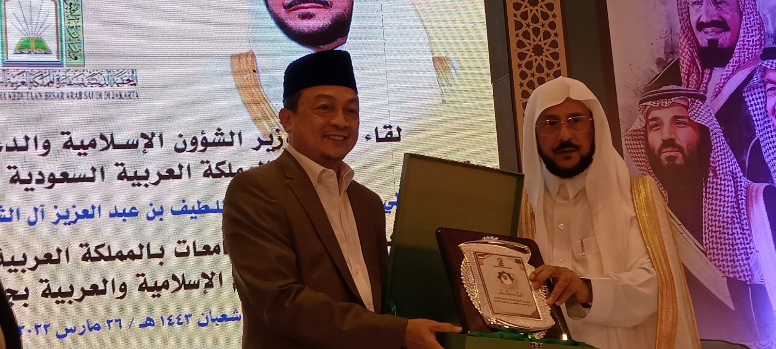 Dalam kesempatan tersebut, Ketua perkumpulan alumni Madinah Islamic University, Ustadz Bachtiar Nasir, menyerahkan plakat kepada Menteri Agama KSA Syeikh Abdul Lathif bin Abdul Azis Al Syeikh. “Kami berterima kasih kepada Kerajaan Saudi atas kerjasama dan perhatian pendidikan kepada Indonesia, khususnya siswa dan mahasiswa Indonesia yang sekolah di Saudi,” Kata Ustadz Bachtiar Nasir.