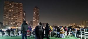 Kami menaiki kapal melalui dermaga River Boat sekitar pukul 8 malam, ketika dingin semakin terasa. Keindahan sungai Nil dapat dinikmati oleh wisatawan. Cahaya yang dipancarkan gedung-gedung pencakar langit yang berdiri mengelilingi sungai bagaikan bintang yang mempercantik indahnya pemandangan malam di sungai nil.