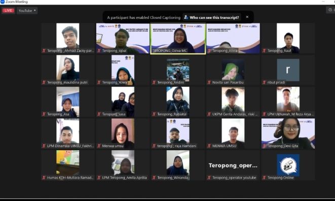 Medan, InfoMu.co – Musyawarah Besar (Mubes) Lembaga Pers Mahasiswa (LPM) Teropong Universitas Muhammadiyah Sumatera Utara (UMSU) ke XXII resmi dibuka. Selasa, (14/02). Kegiatan dibuka secara daring oleh Rektor UMSU yang diwakilkan oleh Kepala Biro Humas UMSU, Dr. Ribut Priadi, M.I.Kom. Selain itu, hadir pula Ketua Forum Alumni Teropong (Format) yang diwakilkan oleh Bendahara Format, Mutia Jafar, S.I.Kom.