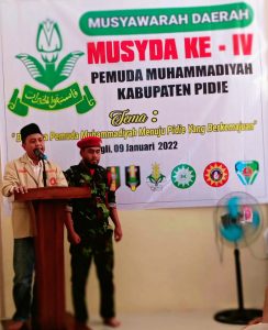 “Pemuda Muhammadiyah diharapkan mampu mensinergikan visi misi persyarikatan sebagai gerakan Islam, gerakan dakwah, dan gerakan tajdid. Mari kita Pemuda Muhammadiyah sebagai pemuda yang cinta masjid, hatinya selalu terpaut dengan masjid, serta tetap bersinergi dengan pemerintah daerah dan PDM Muhammadiyah Pidie,” ungkap Muzakkir yang membuka secara resmi acara Musyda Pemuda Muhammadiyah Pidie ke IV. (Agusnaidi B)