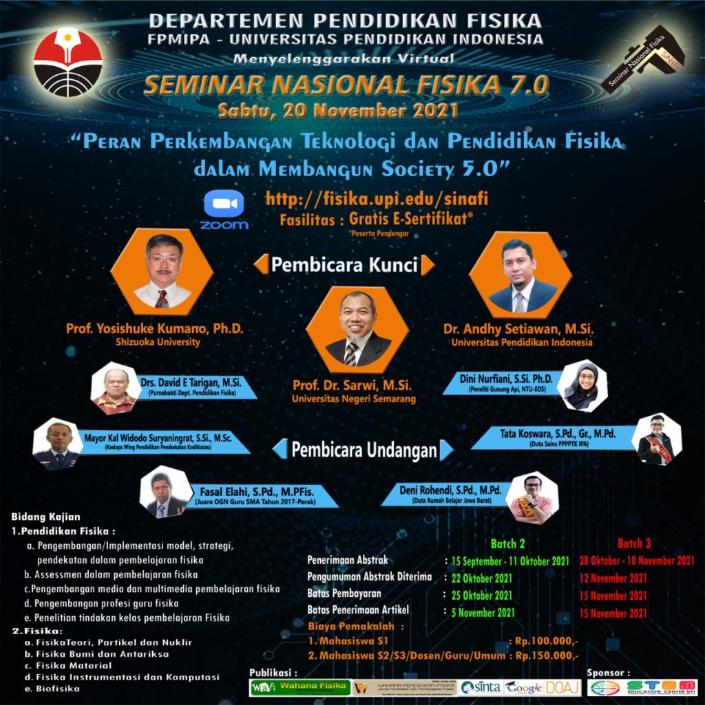 Seminar Nasional Fisika ini sendiri dilaksanakans setiap tahun secara berkala dimana momen kali ini adalah kali yang ke-7 yang mengangkat tema “Peran Teknologi dan Pendidikan Fisika dalam Membangun Society 5.0 di Indonesia”.