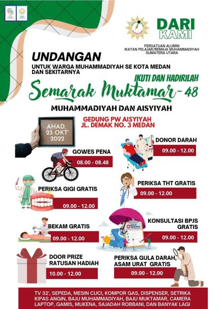 Medan, InfoMu.co – Pagi ini, Ahad (23/10) Persatuan Alumni Ikatan Pelajar/Remaja Muhammadiyah Sumatera Utara akan menggelar berbagai kegiatan untuk menyemarakkan gelaran Muktamar ke 48 Muhammadiyah dan ‘Aisyiyah. Dari informasi yang diterima InfoMu banyak tokoh ( alumni IPM) yang akan hadir. Panitian sudah menyiapkan ratusan hadiah.,