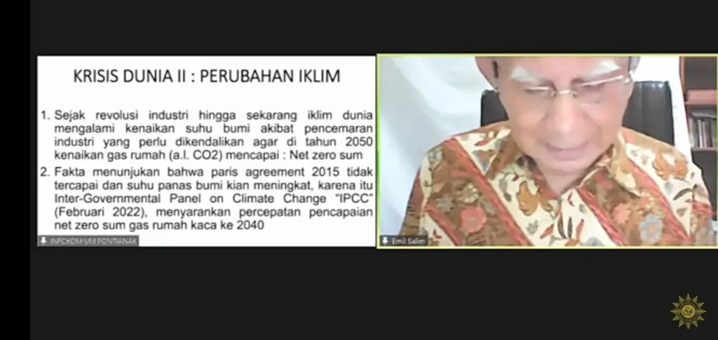 Kemudian, krisis yang dihadapi manusia adalah perubahan iklim. Sejak revolusi industri hingga sekarang iklim dunia mengalami kenaikan suhu bumi akibat pencemaran industri yang perlu dikendalikan agar di tahun 2050 kenaikan gas rumah (a.l. CO2) mencapai : Net zero sum. Prof Emil menuturkan, “Fakta menunjukkan pertemuan paris agreement 2015 sepakat bahwa agar dunia bekerja sama dalam persetujuan paris tersebut agar tahun 2050, jumlah pencemaran udara nol (net zero sum). Artinya kadar pencemaran yang dikeluarkan diikuti kemampuan menghisap”, tandasnya. Tambahnya, inter-Gevemmental Panel on Climate Change “IPCC” dalam laporannya bulan Februari 2022, menyimpulkan bahwa cita-cita ini tidak dicapai bahkan kemungkinan besar bahwa net zero sum, dipercepat tidak pada tahun 2050, akan tetapi tahun 2040.
