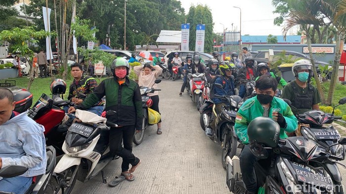 Pantauan di salah satu SPBU di Jalan KL Yos Sudarso Medan, Sabtu (3/9/2022), antrean kendaraan yang didominasi sepeda motor mengular sampai ke jalanan. Para pengendara ini terdiri mulai dari masyarakat umum hingga pengendara ojol.