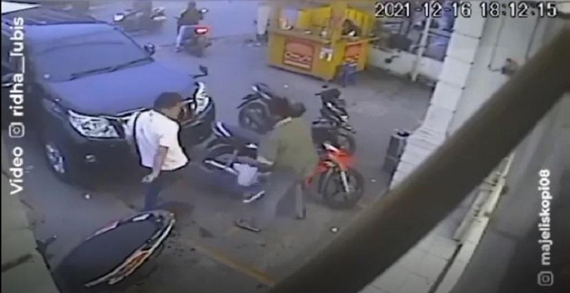 Pemilik mobil lalu turun dari kendaraannya dan keduanya terlibat cekcok. Lalu pria pengemudi mobil yang saat itu memakai baju putih langsung menampar wajah pemilik motor. Penganiayaan berlanjut setelah pemilik mobil menendang dan memukul pemilik motor hingga mundur ke teras minimarket. Pemilik sepeda motor hanya diam dan tidak membalas. (rep)