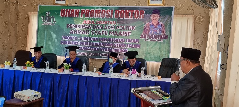 Medan, InfoMu.co – Sultani Silalahi, Putra Barus Tapanuli Tengah, berhasil meraih gelar S3 ( Doktor) diusianya yang mencapai 63 tahun. Disertasinya yang berjudul ” Pemikiran dan Aksi Politik Syafii Ma’arif” mengantarkan Wakil ketua Pimpinan Daerah Muhammadiyah Tapanuli Tengah itu meraih gelar Doktor dengan hasil ‘memuaskan’ pada sidang promosi ( sidah terbuka ) prodi Aqidah dan Filsafat Islam Universitas Islam Negeri Sumatera Utara (UINSU), Kamis 15/9.