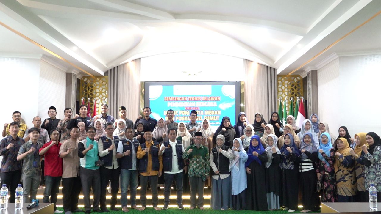 INFOMU.CO ! Medan — Dalam menanggapi bencana banjir bandang dan tanah longsor yang terjadi di Sumatera Utara, Aceh, dan Sumatera Barat, Pos Koordinasi Muhammadiyah Wilayah (Poskorwil) Sumatera Utara bersama Muhammadiyah Disaster Management Center (MDMC) Kota Medan menggelar Bimbingan Teknis (Bimtek) Relawan Pendidikan Bencana, Jumat, 26 Desember 2025. Kegiatan ini dilaksanakan di Aula Gedung Dakwah Muhammadiyah Sumatera Utara, Jalan S.M. Raja No. 136, Medan.