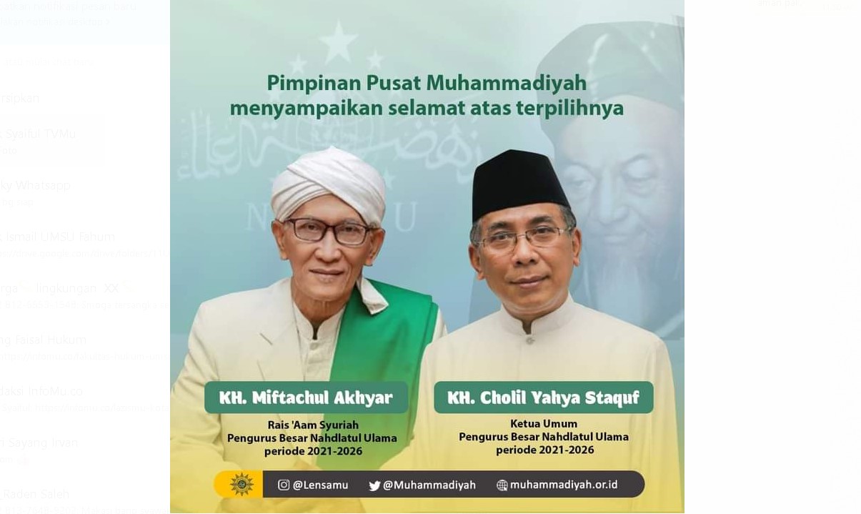 Medan, InfoMu.co – Pimpinan Pusat Muhammadiyah menyampaikan selamat atas terpilihnya KH Miftachul Akhyar selaku Rais ‘Aam Syuriah Pengurus Besar Nahdlatul Ulama (PBNU) serta KH Cholil Yahya Staquf sebagai Ketua Umum PBNU periode 2021-2026.