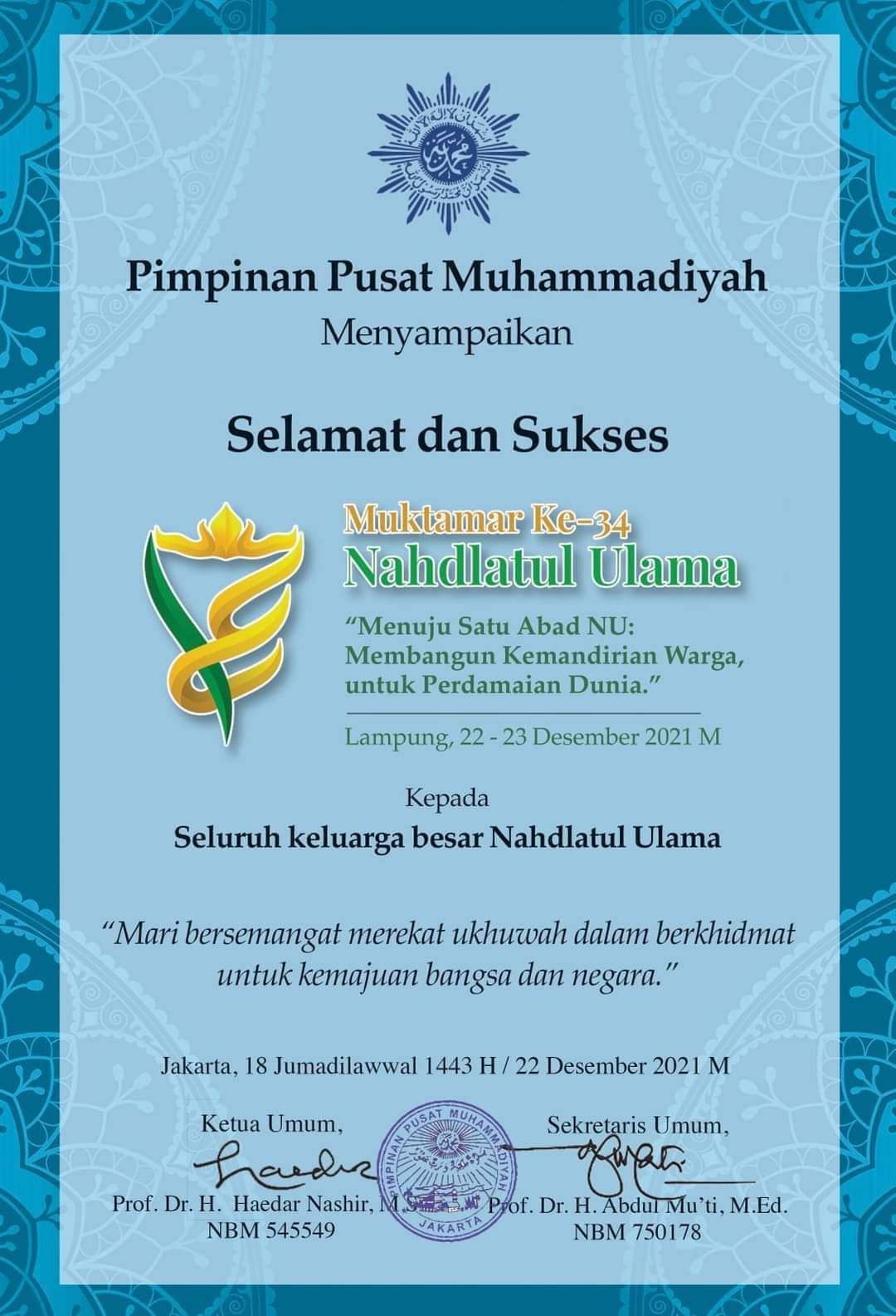 Pimpinan Pusat Muhammadiyah menyampaikan selamat dan berharap muktamar kali ini menghasilkan kemaslahatan bagi NU dan bangsa Indonesia. “Semoga Muktamar dapat berjalan dengan baik, lancar, dan sukses yang menghasilkan keputusan-keputusan penting bagi kemajuan dan kemaslahatan NU, umat,  bangsa, dan kemanusiaan di ranah global,” tutur Haedar Nashir, Ketua Umum Pimpinan Pusat Muhammadiyah (22/12/2021).