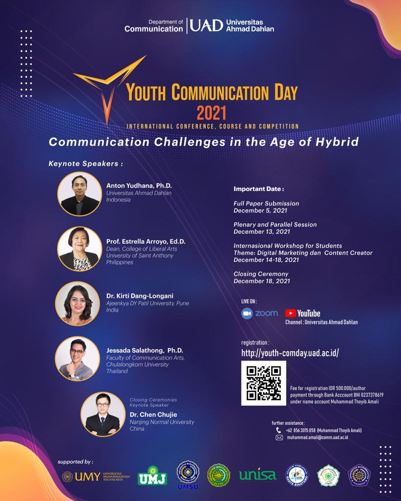 Youth Communication Day 2021 didukung oleh Universitas Muhammadiyah Yogyakarta (UMY), Universitas Muhammadiyah Jakarta (UNJ), Universitas Sumatera Utara (UMSU), Universitas Muhammadiyah Buton, dan Universitas ‘Aisyiyah (UNISA).