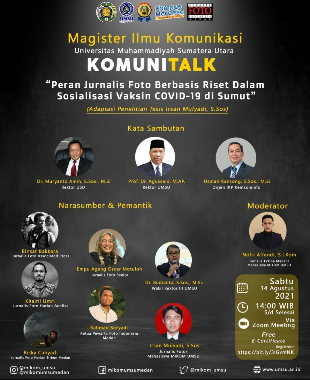 Medan, InfoMu.co – Siang nanti, Sabtu (14/8) pukul 14.00 Wib Magister Ilmu Komunuikasi (Mikom) UMSU menggelar web-seminar (webinar) dengan menghadirkan jurnalis foto beken yang bekerja dibeberapa media terkenal di Sumatera Utara. Webinar kali ini mengangkat tema : Pesan Jurnalis Foto Berbasis Riset dalam Sosialisasi Vaksin Covid19 di Sumut.