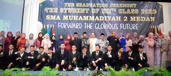 Kegiatan wisuda berlangsusung Rabu (17/5) di Auditorium Aceh Sepakat, Jalan Mangkara, Medan mengambil tema “The Gradation Ceremony the Studen of XII Class 2023 SMA Muhammadiyah 2 Medan” dihadiri berbagai tokoh seperti Muhammad Basir Hasibuan, Kepala Bidang SMA pada Kantor Dinas Pendidikan Sumatera Utara, Aswin Bancin, Sekretaris Dikdasmen PW Muhammdiyah, Ketua PC Muhammadiyah Tanjung Sari, Kepala SMAM-2, Taufiq Pasaribu serta ratusan orangtua pelajar.