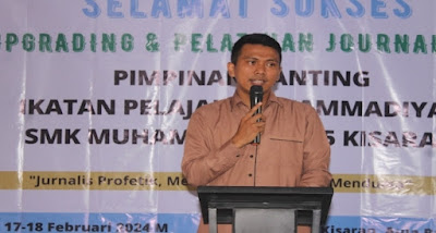 Ketua Umum Pimpinan Ranting Ikatan Pelajar Muhammadiyah (PR. IPM) Kiki Rizki Ananda Panjaitan dalam sambutannya mengucapkan terima kasih kepada kepala sekolah dan kakak-kakak dari Ikatan Alumni (IKA) SMK Muhammadiyah 5 Kisaran yang telah menyelenggarakan kegiatan Upgrading dan Pelatihan Jurnalistik yang akan dilaksanakan Hingga hari Ahad, 18 Februari 2024 mendatang.