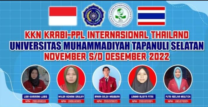 Padangsidimpuan, InfoMu.co – Universitas Muhammadiyah Tapanuli Selatan (UM-Tapsel) mengirim 5 mahasiswanya mengikuti kegiatan Kuliah Kerja Nyata (KKN) atau Praktik Pengalaman Lapangan (PPL) Internasional di Eakkapapsasanawich Islamic School Krabi, Thailand. Kegiatan dimaksud merupakan kegiatan annual atau kegiatan yang diselenggarakan tiap tahunnya dari berbagai universitas baik dalam dan luar negeri.
