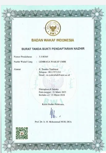 Pekanbaru, InfoMu.co – Badan Wakaf Indonesia (BWI) Pusat secara resmi mengesahkan Lembaga Wakaf Universitas Muhammadiyah Riau (UMRI). Keputusan tersebut ditandatangani langsung oleh Prof. Dr. Mohammad Nuh sebagai Ketua pada tanggal 22 Maret 2023 yang lalu.
