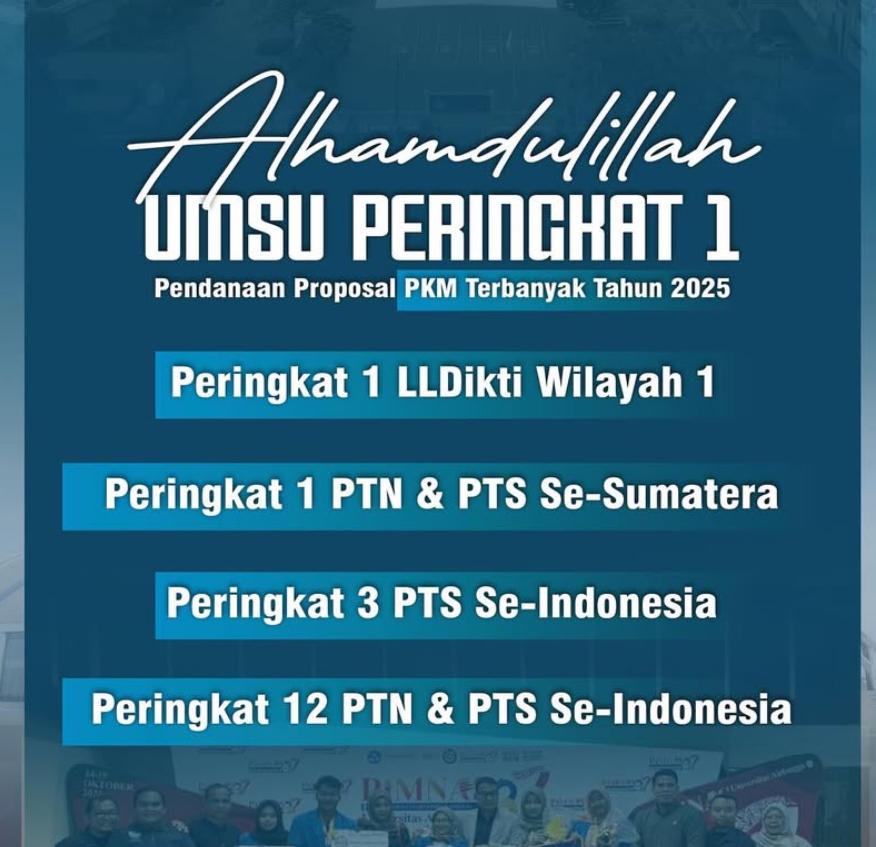 INFOMU.CO | Medan – Universitas Muhammadiyah Sumatera Utara (UMSU) kembali mencatatkan hasil membanggakan dalam Program Kreativitas Mahasiswa (PKM) tahun 2025. Berdasarkan pengumuman resmi dari Direktorat Pembelajaran dan Kemahasiswaan Kementerian Pendidikan Tinggi, Sains, dan Teknologi, UMSU berhasil meloloskan 20 judul proposal dengan total pendanaan sebesar Rp141.210.000. Jumlah tersebut menempatkan UMSU sebagai perguruan tinggi dengan jumlah proposal terbanyak yang didanai di seluruh wilayah Sumatera, baik dari perguruan tinggi negeri maupun swasta. Di tingkat nasional, UMSU berada di posisi tiga besar di antara seluruh PTS penerima pendanaan PKM, dan peringkat 12 untuk PTN/PTS bersaing dengan berbagai Universitas se Indonesia.