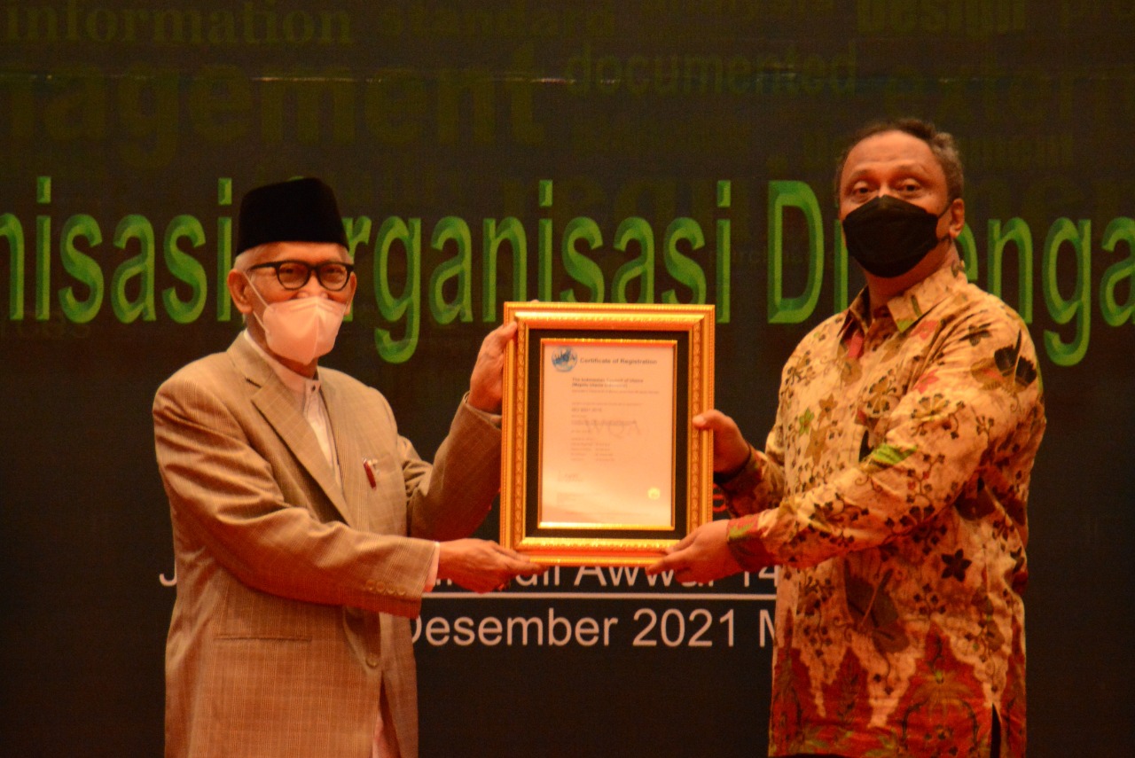Penyerahan Sertifikat ISO 9001: 2015 dilakukan secara simbolik kepada Ketua Umum MUI, KH Miftachul Akhyar oleh Komisaris WQA Regional Asia Pasifik, Iskandar Zulkarnain, Selasa (7/12). Turut menyaksikan penyerahan sejumlah tokoh antara lain Wakil Menteri Agama, Zainut Tauhid Sa’adi, Ketua MPR  RI Bambang Soesatyo, sejumlah duta besar negara sahabat, dan segenap dewan pimpinan harian MUI.